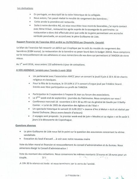 ·        Demande de restauration des bannières, mais cela coute très cher .C’est une action à prévoir pour l’avenir. Dans un premier temps , acheter un meuble pour les placer ce qui serait un cadeau de l’ANODA à la collégiale.